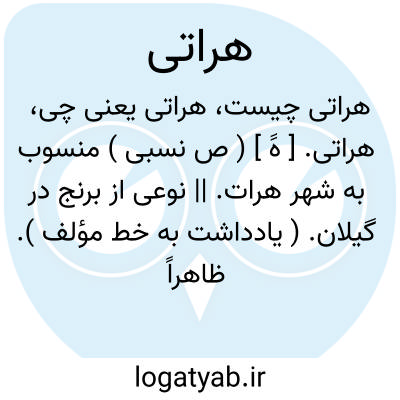 (صفت ) منسوب به هرات ۱- ازمردم هرات. ۲- ساخت. هرات. ۳- نوعی برنج گیلانی (ظاهرامنسوب به دهکد. هرات رودسر ).