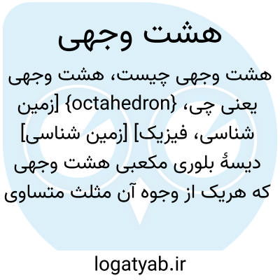 {octahedron} [زمین شناسی، فیزیک] [زمین شناسی] دیسۀ بلوری مکعبی هشت وجهی که هریک از وجوه آن مثلث متساوی الاضلاع است [فیزیک] جسمی فضایی که از دو هرم با قاعدۀ مربعی مشترک ساخته می شود
