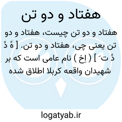 هفتاد و دو تن. [ هََ دُ دُ ت َ ] ( اِخ ) نام عامی است که بر شهیدان واقعه کربلا اطلاق شده است. آخرین کسانی که با امام حسین علیه السلام در جنگ با سپاه یزید مقاومت کردند و کشته شدند هفتادودو تن بودند.
