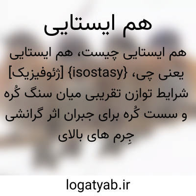 {isostasy} [ژئوفیزیک] شرایط توازن تقریبی میان سنگ کُره و سست کُره برای جبران اثر گرانشی جِرم های بالای زمینوار و کمبود چگالی در آب های اقیانوس