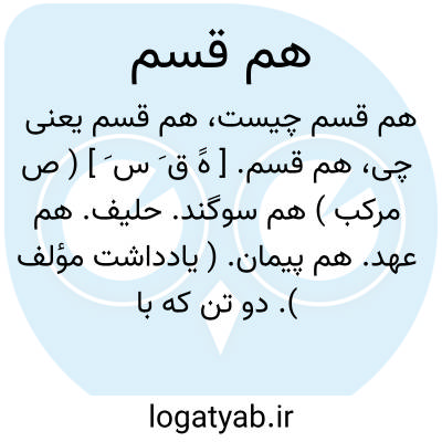 هم قسم. [ هََ ق َ س َ ] ( ص مرکب ) هم سوگند. حلیف. هم عهد. هم پیمان. ( یادداشت مؤلف ). دو تن که با یکدیگر بر سر کاری سوگند خورند.