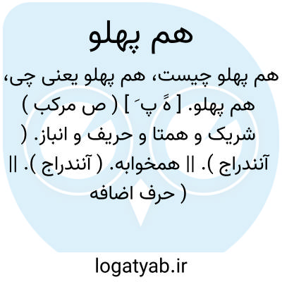 ( صفت ) ۱- قرین نظیر. ۲- مجاور کنار: وهم آنجایگاه هم پهلوی هارون الرشید دفن کردند. ۲- همپایه.