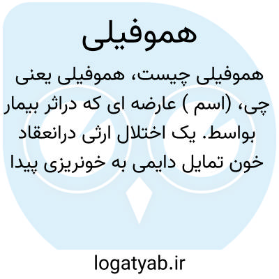 (اسم ) عارضه ای که دراثر بیمار بواسط. یک اختلال ارثی درانعقاد خون تمایل دایمی به خونریزی پیدا میکندهموفیلی در فرزندان ذکور ظاهرمیشود و غالباافرادی که هموفیلی دارند در سنین کودکی بواسط. پیدایش یک خراش در بدن که سبب خونریزی زیاد میشود ازبین میروند و ندرتا به سن بالا میرسند در فرزندان اناث زن هموفیلی بصورت نهفته باقی میماند و آنرا باخلاف ذکور خود بطور ارثی منتقل میسازد که در آنها ظاهر میشود ولی بازبصورت نهفته باقی میماند.