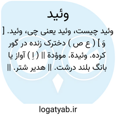 وئید. [ وَ ] ( ع ص ) دخترک زنده در گور کرده. وئیدة. موؤدة || ( اِ ) آواز یا بانگ بلند درشت. || هدیر شتر. || آهستگی. درنگی. ( منتهی الارب ) ( آنندراج ).