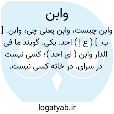 وابن. [ ب ِ ] ( ع اِ ) احد. یکی. گویند ما فی الدار وابن ( ای احد )؛ کسی نیست در سرای. در خانه کسی نیست. وکذا ما فی الدار وابر. ( تاج العروس ) ( منتهی الارب ) ( ناظم الاطباء ). در مقام نبودن کسی در جایی ذکر شود.