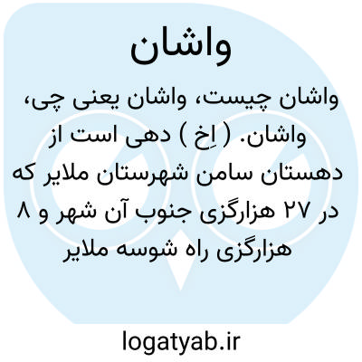 واشان. ( اِخ ) دهی است از دهستان سامن شهرستان ملایر که در 27 هزارگزی جنوب آن شهر و 8 هزارگزی راه شوسه ملایر به بروجرد واقع است. ناحیه ای است مسطح، معتدل با 752 تن سکنه که از آب چشمه مشروب میشود. محصول آنجا غلات دیم و شغل اهالی زراعت و اشتغال به صنایع دستی و قالی بافی است. این دهکده دارای راه اتومبیل رو است. ( از فرهنگ جغرافیائی ایران ج 5 ).