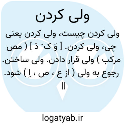 (مصدر ) ۱- ولی قرار دادن. ۲- طعامی که ۲ - ولیعهد کردن جانشین کردن: (( طغرل بک را فرزند نبود الب ارسلان محمد پسر برادرش داود را ول و وصی کرد... ) ) ۳- کسی را بمیزبانی و پرداخت مخارج عیش و عشرت راضی کردن: (( دیشب فلان کس را ولی کردیم و عرق سیری خوردیم. ) ) ولیکن: ۱- استثنا را رساند ولی اما: (( ولیکن ز دستور باید شنید بد و نیک بی او نیاید پدید. ) ) ( شا ) ۲- از این جهت بالنتیجه. توضیح ولیکن از ((ولکن ) ) عربی ممال شده و بنابراین کاف آن مکسوراست نه مفتوح.