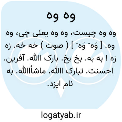 وه وه. [ وَه ْ وَه ْ ] ( صوت ) خه خه. زه زه ! به به. بخ بخ. بارک اﷲ. آفرین. احسنت. تبارک اﷲ. ماشأاﷲ. به نام ایزد. تعالی اﷲ. زه. زهی. ( یادداشت مرحوم دهخدا ). وه وه کلمه ای است دال بر تعجب و شگفتی. شگفتا. عجبا. ( انجمن آرا ):