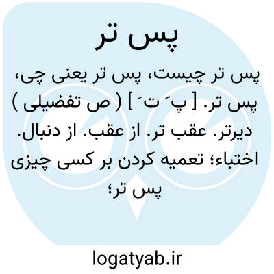 پس تر. [ پ َ ت َ ] ( ص تفضیلی ) دیرتر. عقب تر. از عقب. از دنبال. اختباء؛ تعمیه کردن بر کسی چیزی پس تر؛ پرسیدن او را از آن. ( منتهی الارب ):