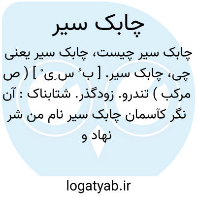 جمله سازی با چابک سیر شاه در خاک نهاد این فلک چابک سیر در همه جایگهی آتش از آن میسوزد ماه چابک سیر در یک جا نمی گردد مقیم ماه را سرگشته در گردون گردان آفرید آن نگر کاسمان چابک سیر نام من شر نهاد و نام تو خیر