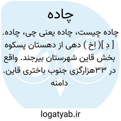 چاده. [ دِ ]( اِخ ) دهی از دهستان پسکوه بخش قاین شهرستان بیرجند. واقع در 33هزارگزی جنوب باختری قاین. دامنه، معتدل، 57 تن سکنه. شیعه، فارسی. آب آن از قنات. محصول آنجا غلات، زعفران، تریاک. شغل اهالی زراعت و مالداری راه آن مالرو است. ( از فرهنگ جغرافیائی ایران ج 9 ).