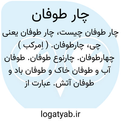 چارطوفان. ( اِمرکب ) چهارطوفان. چارنوع طوفان. طوفان آب و طوفان خاک و طوفان باد و طوفان آتش. عبارت از طوفان آب که بر قوم نوح علیه السلام رسیده و طوفان باد بر قوم هود علیه السلام و طوفان آتش بر قوم لوط علیه السلام و طوفان خاک بر قوم صالح علیه السلام. ( آنندراج ):