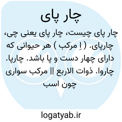 چارپای. ( اِ مرکب ) هر حیوانی که دارای چهار دست و پا باشد. چارپا. چاروا. ذوات الاربع || مرکب سواری چون اسب و استر و خر و شتر و امثال آن. ستور. نعم. بهیمه. ماشیه. مال: