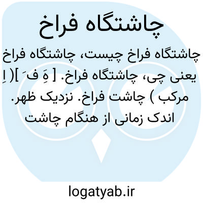 💡 از چاشت به چم خوراکی میانهٔ روز واژگان چاشتگاه به چم هنگام چاشت، هنگام خوردن چاشت و همچنین آمیغِ جاشتگاه فراخ به چم اندک زمانی از هنگام چاشت گذشته، نزدیک نیمروز، ساخته شده‌اند. چاشتگاه فراخ را نیز چاشتِ فراخ گویند که در دومی چاشت به چم نیمهٔ‌روز است. واژگان چاشتگاه و چاشتگاه فراخ در روستاهای خراسان، به‌ویژه خراسان اباخترین پرکاربرد است.