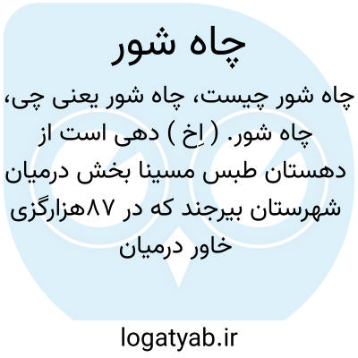 چاه شور. ( اِخ ) ده کوچکی است از دهستان حیات داود بخش گناوه شهرستان بوشهر که در 20 هزارگزی شمال گناوه واقع شده و 15 هزار تن سکنه دارد. ( از فرهنگ جغرافیایی ایران ج 7 ).، چاهشور. ( اِخ ) دهی است از دهستان مرکزی بخش قاین شهرستان بیرجند که در 59 هزارگزی شمال باختری قاین واقع شده. دامنه و گرمسیر است و 57 تن سکنه دارد.آبش از قنات، محصولش غلات و شلغم، شغل اهالی زراعت وراهش مالرو است. ( از فرهنگ جغرافیایی ایران ج 9 ).