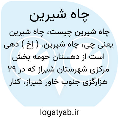 چاه شیرین. ( اِخ ) دهی است از دهستان لیراوی بخش دیلم شهرستان بوشهر که در 21 هزارگزی جنوب خاور دیلم و 2 هزارگزی راه فرعی گچساران به دیلم واقع شده. جلگه، گرمسیر و مالاریائی است و 86 تن سکنه دارد. آبش از چاه، محصولش غلات، شغل اهالی زراعت وراهش مالرو است. ( از فرهنگ جغرافیایی ایران ج 7 ).