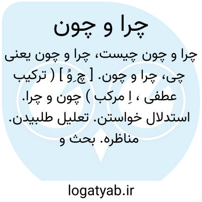 چرا و چون. [ چ ِوُ ] ( ترکیب عطفی، اِ مرکب ) چون و چرا. استدلال خواستن. تعلیل طلبیدن. مناظره. بحث و تعلیل: