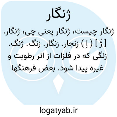ژنگار. [ ژَ ] ( اِ ) زنجار. زنگار. زنگ. ژنگ. زنگی که در فلزات از اثر رطوبت و غیره پیدا شود. بعض فرهنگها ژنگار یا زنگار را بخصوص به رنگ سبز که بر فلز نشیند اطلاق کرده اند: