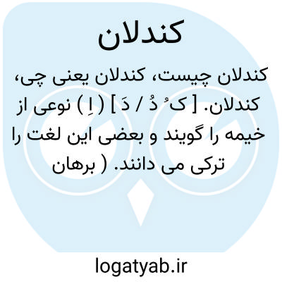 کندلان. [ ک ُ دُ / دَ ] ( اِ ) نوعی از خیمه را گویند و بعضی این لغت را ترکی می دانند. ( برهان ). خیمه ای بزرگ که در پیش درگاه ملوک بر پای دارند و این لغت را برخی ترکی می دانند. ( آنندراج ) ( انجمن آرا ). خیمه ای کلان و بزرگ که در پیش دروازه پادشاه استاده کنند و این لفظ ترکی است. ( غیاث ). خیمه ای بزرگ که پیش ملوک ایستاده کنند و بعضی گویند ترکی است. ( فرهنگ رشیدی ). نوعی از خیمه و چادر. ( ناظم الاطباء ):