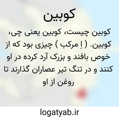 ( صفت اسم ) ۱ - آلتی است مانند کف. ترازو که از برگ خرما یا ازنی سازند و استادان روغنگر و عصار مغز های کوفته را در آن کنند و در تنگ تیر ( تیر شکنج. عصاری ) نهند تا روغن آن بر آید معدل: باز گشای ای نگار. چشم بعبرت تات نکوبد فلک بکوب. کوبین. ۲ - کدین گازران: وانگهی فرزند گازر گازری ساز دز تو شوید کوبد ترا در زیر کوبین زرنگ.