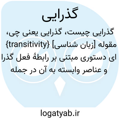 {transitivity} [زبان شناسی] مقوله ای دستوری مبتنی بر رابطۀ فعل گذرا و عناصر وابسته به آن در جمله