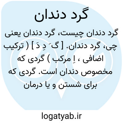 لغت نامه دهخدا گرد دندان. [ گ َ دِ دَ ] ( ترکیب اضافی، اِ مرکب ) گردی که مخصوص دندان است. گردی که برای شستن و یا درمان دندانها به کار رود.، گرددندان. [ گ ِ دَ ] ( ص مرکب ) دندان گرد. بخیل. خسیس. لئیم.