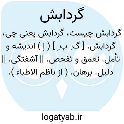 گردابش. [ گ ِ ب ِ ] ( اِ ) اندیشه و تأمل. تعمق و تفحص. || آشفتگی. || دلیل. برهان. ( از ناظم الاطباء ).