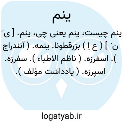 ینم. [ ی َ ن َ ] ( ع اِ ) بزرقطونا. ینمه. ( آنندراج ). اسفرزه. ( ناظم الاطباء ). سفرزه. اسپرزه. ( یادداشت مؤلف ). || گیاهی که در التیام زخمها به کار آید. ( ناظم الاطباء ) ( آنندراج ). نباتی است. ( مهذب الاسماء ).