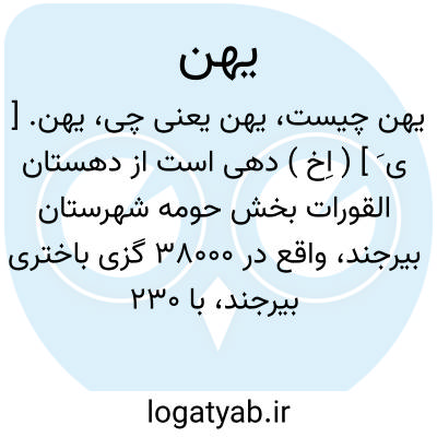 یهن. [ ی َ ] ( اِخ ) دهی است از دهستان القورات بخش حومه شهرستان بیرجند، واقع در 38000 گزی باختری بیرجند، با 230 تن سکنه. آب آن از قنات و راه آن مالرو است. مزارع کرمانی بالا و پایین، تیتوت کرانه، مزارده، نیشکوک بالا و پایین، خونیک یهن، علی ناری بالا و پایین جزو این ده است. ( از فرهنگ جغرافیایی ایران ج 9 ).