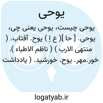 یوحی. [ حا ]( ع اِ ) یوح. آفتاب. ( منتهی الارب ) ( ناظم الاطباء ). خور.مهر. یوح. خورشید. ( یادداشت مؤلف ). گاهی یوح را یوحی گویند. ( از نشوءاللغة ص 28 ). و رجوع به یوح شود.