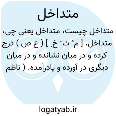 ( اسم ) ۱ - داخل شده ( در یکدیگر ) در میان آمده جمع: متداخلین. ۲ - هر گاه اجزای ماهیتی بنحوی باشد که بعضی از آنها اعم از بعضی دیگر باشد آنرا متداخل ( متداخله ) گویند و اگر چنین نباشد متباین ( متباینه ) گویند. ۳ - دو عدد را متداخل گویند وقتی که یکی بر دیگری قابل قسمت باشد و خارج قسمت آنها عدد صحیح و بعبارت دیگر بزرگترین مقسوم علیه مشترک آنها نفس عدد کوچکتر باشد مانند ۱۲ و ۴ که عدد ۱۲ بر ۴ قابل تقسیم است و باقی ماند. آنها صفر و خارج قسمت نیز عددی صحیح است.