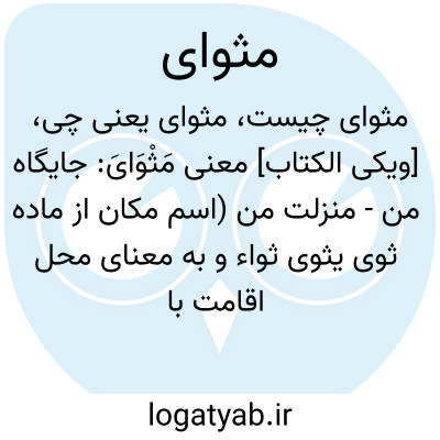 [ویکی الکتاب] معنی مَثْوَایَ: جایگاه من - منزلت من (اسم مکان از ماده ثوی یثوی ثواء و به معنای محل اقامت با استقرار است ) ریشه کلمه: ثوی (۱۴ بار)ی (۱۰۴۴ بار)