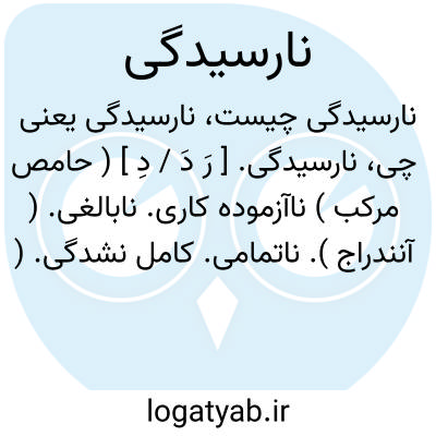 نارسیدگی. [ رَ دَ / دِ ] ( حامص مرکب ) ناآزموده کاری. نابالغی. ( آنندراج ). ناتمامی. کامل نشدگی. ( ناظم الاطباء ). صغر. اندک سالی. بی تجربگی. رسیده و کامل و بالغ نبودن. || خامی. ( آنندراج ) ( ناظم الاطباء ). کالی. نارسی. ناپختگی.
