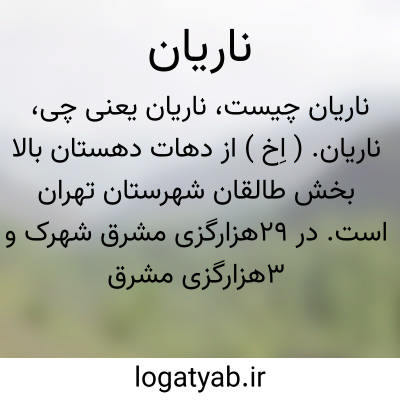 ناریان. ( اِخ ) از دهات دهستان بالا بخش طالقان شهرستان تهران است. در 29هزارگزی مشرق شهرک و 3هزارگزی مشرق راه عمومی طالقان به کلاردشت قرار دارد. ناحیه ای کوهستانی و سردسیر است با 944 نفر سکنه، آب آنجا از چشمه سار است و محصولش غلات، سیب زمینی، باقلا و بنشن و دیگر محصولات صیفی. شغل مردمش زراعت و گله داری، صنعت دستی اهالی بافتن گلیم و جاجیم و کرباس است. عده ای از اهالی این ده برای تأمین معاش به تهران می روند. راه مالرو دارد. ( از فرهنگ جغرافیائی ایران ج 1 ص 220 ).
