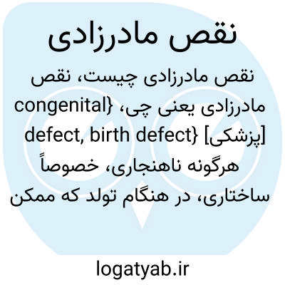 {congenital defect, birth defect} [پزشکی] هرگونه ناهنجاری، خصوصاً ساختاری، در هنگام تولد که ممکن است منشأ ژن شناختی داشته باشد یا در هنگام بارداری یا زایمان به وجود آمده باشد