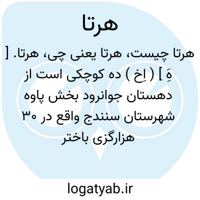 هرتا. [ هَِ ] ( اِخ ) ده کوچکی است از دهستان جوانرود بخش پاوه شهرستان سنندج واقع در 30 هزارگزی باختر پاوه، کنار رودخانه سیروان ( مرز عراق ). جایی است کوهستانی و گرمسیر و دارای 10 تن سکنه است. ( از فرهنگ جغرافیایی ایران ج 5 ).