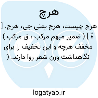 هرچ. [ هََ ] ( ضمیر مبهم مرکب، ق مرکب ) مخفف هرچه و این تخفیف را برای نگاهداشت وزن شعر روا دارند. ( یادداشت به خط مؤلف ). هرچه. هر چیزی که. هر آنچه: