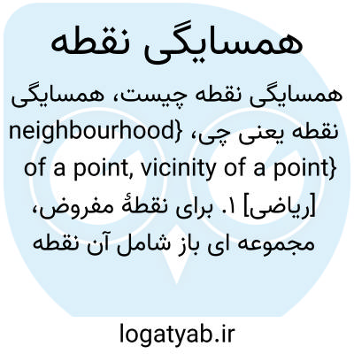 {neighbourhood of a point, vicinity of a point} [ریاضی] 1. برای نقطۀ مفروض، مجموعه ای باز شامل آن نقطه در یک فضای توپولوژیکی 2. برای نقطۀ مفروض، گوی بازی به مرکز آن نقطه در یک فضای متریک