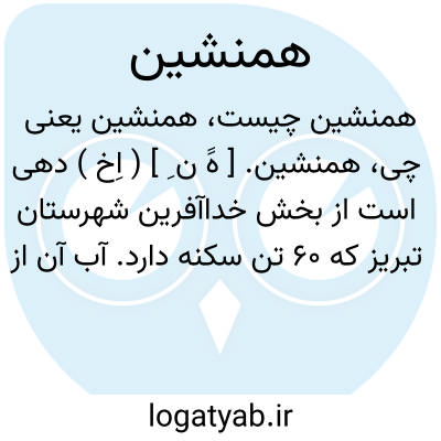 همنشین. [ هََ ن ِ ] ( اِخ ) دهی است از بخش خداآفرین شهرستان تبریز که 60 تن سکنه دارد. آب آن از چشمه و محصول عمده اش غله است. ( از فرهنگ جغرافیایی ایران ج 4 ).، هم نشین. [ هََ ن ِ ] ( نف مرکب ) هم نشین. هم نشست. ( یادداشت مؤلف ). دو تن که با هم یک جا نشسته و مصاحب باشند. ( برهان ):