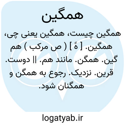 همگین. [ هََ ] ( ص مرکب ) هم گین. همگن. مانند هم. || دوست. قرین. نزدیک. رجوع به همگن و همگنان شود.