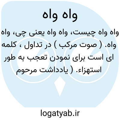 واه واه. ( صوت مرکب ) در تداول، کلمه ای است برای نمودن تعجب به طور استهزاء. ( یادداشت مرحوم دهخدا ). آنندراج ذیل واه و وی آرد: کلمه استلذاذ و کلمه تحریک به استلذاذ است و معنی آن در فارسی چه خوش ! کذا فی کنزاللغة، فارسیان بدین معنی واه واه به تکرار و وه وه بدون هر دو الف استعمال کنند.
