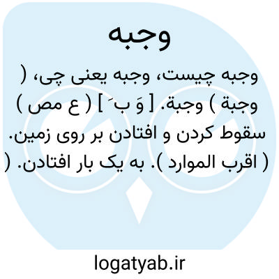 ( وجبة ) وجبة. [ وَ ب َ ] ( ع مص ) سقوط کردن و افتادن بر روی زمین. ( اقرب الموارد ). به یک بار افتادن. ( منتهی الارب ) ( اقرب الموارد ) ( ناظم الاطباء ). و در تاج العروس آمده که وزن فعله در اینجا برای مره واحده نیست بلکه مصدر است مانند وجوب. ( اقرب الموارد از تاج العروس ). || افتادن با صدای شدید. ( ناظم الاطباء ) ( اقرب الموارد ). || یک بار خوردن در شبانه روزی و یا خوردن هر روز به وقتی معین. ( منتهی الارب ) ( ناظم الاطباء ). خوردن به روز یک بار. ( المصادر زوزنی ): هو یأکل الوجبة؛ ای یأکل فی الیوم و اللیل مرة. ( منتهی الارب ) ( اقرب الموارد ). ج، وجبات. ( اقرب الموارد ) ( منتهی الارب ) ( ناظم الاطباء ). || وجوب. ( ناظم الاطباء ). رجوع به وجوب شود. || ( اِ ) بانگ چیزی که می افتد. ( ناظم الاطباء ) ( از اقرب الموارد ). شکوخیدگی یا بانگ برفتنده. ( منتهی الارب ).