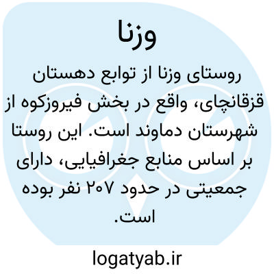 وزنا. [ ] ( اِخ ) دهی جزو دهستان قزقانچای بخش فیروزکوه شهرستان دماوند. سکنه 207 تن. آب آن از چشمه رخش رود و کیاکتل سرچشمه قزقانچای. محصول آنجا غلات،بنشن و شغل اهالی زراعت است، در زمستان به حدود مازندران و گیلان می روند و به شغل مس فروشی و پیله وری و کارگری و مکاری گری مشغول میشوند و در بهار برمیگردند.مزرعه رخش رود جزو این ده است. از ایل سنگسری به حدود این ده می آیند. ( از فرهنگ جغرافیایی ایران ج 1 ).