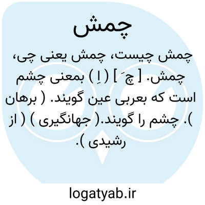 چمش. [ چ َ ] ( اِ ) بمعنی چشم است که بعربی عین گویند. ( برهان ). چشم را گویند.( جهانگیری ) ( از رشیدی ). مقلوب چشم است و مخفف آن. ( انجمن آرا ). مقلوب چشم است که بعربی عین گویند. ( آنندراج ). چشم و دیده و عین. ( ناظم الاطباء ):