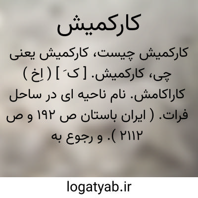 کارکمیش. [ ک َ ] ( اِخ ) کاراکامش. نام ناحیه ای در ساحل فرات. ( ایران باستان ص 192 و ص 2112 ). و رجوع به کاراکامش شود.