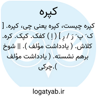 کپره. [ ک َ پ َ رَ / رِ ] ( اِ ) کفک. کپک. کره. کلاش. ( یادداشت مؤلف ). || شوخ برهم نشسته. ( یادداشت مؤلف ).چرکی که روی اشیاء بندد. ( فرهنگ فارسی معین ). کوره.کبره. پینه. شغه. شوغه. آنچه بر پشت دست و امثال آن بندد از شوخ. ( یادداشت مؤلف ). رجوع به کبره شود.