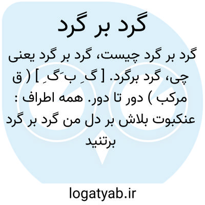 سخنگوی بوزرجمهر و ردان.فردوسی.امیر گرد بر گرد قلعت بگشت. ( تاریخ بیهقی ). این خادم و غلامان به وثاقها که گردبر گرد درگاه بود فرودآمدند. ( تاریخ بیهقی ). گرد برگرد آن درختان، بیست نرگس دانها نهاده. ( تاریخ بیهقی ). و گفت نیکو فرزندی است که خدا به من داده است، گرد بر گرد آن سنگ و ریگ جمع میکرد. ( قصص الانبیاء ص 50 ). فاطمه و حسنین ( ع ) گرد بر گرد سید عالم نشسته و سید عالم بر نهالی که از لیف خرما بافته بودند. ( قصص الانبیاء ص 442 ). و این قلعه است که گرد بر گرد کوه آن بیست فرسنگ باشد. ( فارسنامه ابن البلخی ص 158 ). به حکم آنکه فیروزآباد در میان آخره نهاده است که پیرامون آن کوهی گرد بر گرد درآمده است. ( فارسنامه ابن البلخی ص 137 ). و سوری استوار گرد بر گرد شهر [ شیراز] در کشید. ( فارسنامه ابن البلخی ص 133 ).