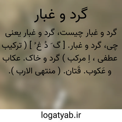 گرد و غبار. [ گ َ دُ غ ُ ] ( ترکیب عطفی، اِ مرکب ) گرد و خاک. عکاب و عَکوب. قَتان. ( منتهی الارب ). رجوع به گرد و خاک شود. || ( ص مرکب ) رند. لغت محلی شوشتر. ( نسخه خطی ).