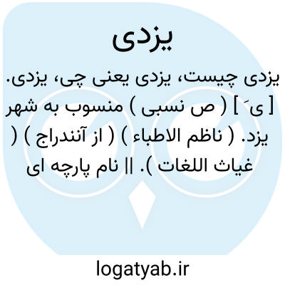 (صفت ) منسوب به یزدگرد ۱- ازمردم یزد. ۲- آنچه دریزدبافتهیاساختهشود: چادرشب یزدی.