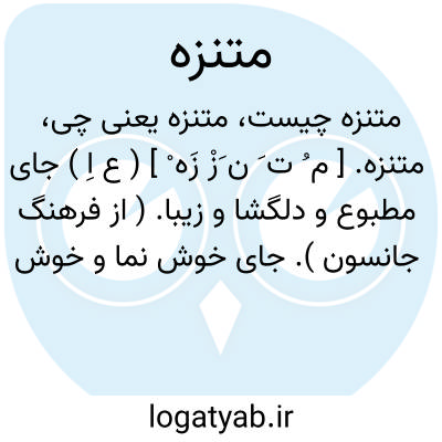 متنزه. [ م ُ ت َ ن َزْ زَه ْ ] ( ع اِ ) جای مطبوع و دلگشا و زیبا. ( از فرهنگ جانسون ). جای خوش نما و خوش آیند و دلپذیر و تفرجگاه. ( ناظم الاطباء ). نزهت جای. ج، متنزهات. ( مهذب الاسماء ).نزهت گاه. ( یادداشت به خط مرحوم دهخدا ): موضعی به غایت نزه و خرم و متنزهی بی رنج و غم. ( سندبادنامه ص 166 ). من روی بدان طرف آوردم و در متنزهات آن بقعه با فراغی هر چه تمامتر روزگار گذراندم. ( ترجمه تاریخ یمینی چ 1 تهران ص 31 ). و چون حسن بهار بغایت رسیدی و سبزه ها هر یک بمقدار خویش بالا نمودی روی به متنزهی دیگر نهادی. ( جهانگشای جوینی ). ایوان بر بساتین و متنزهات قلم کل ماهوآت آت این ابیات اثبات کرده. ( جهانگشای جوینی ). و بر یاد جوانانی که هر بهاربر چهره انوار و ازهار در بساتین و متنزهات... و غمگسار بودندی. ( جهانگشای جوینی ). دیگر آن که کشت نارنج متفرجی نزه و متنزهی بدیع باشد. ( تجارب السلف ).